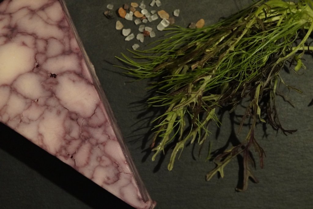 ポートワインを混ぜ込み、紫色の大理石模様が美しいチェダーチーズ。ブドウの甘味も楽しめる遊び心がある。